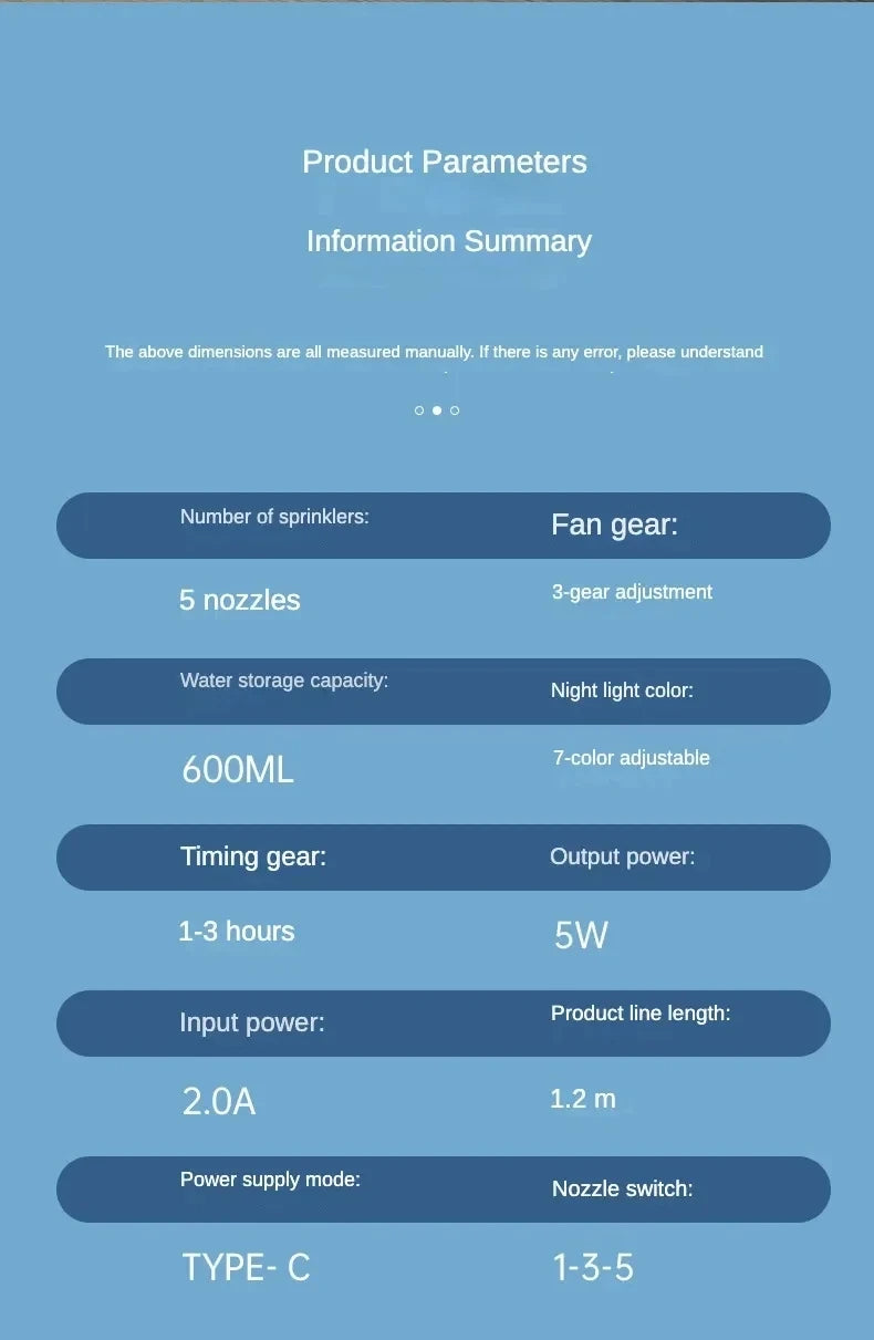 No batteries needed. Just charge it via USB type-C and enjoy hours of refreshing mist and airflow.